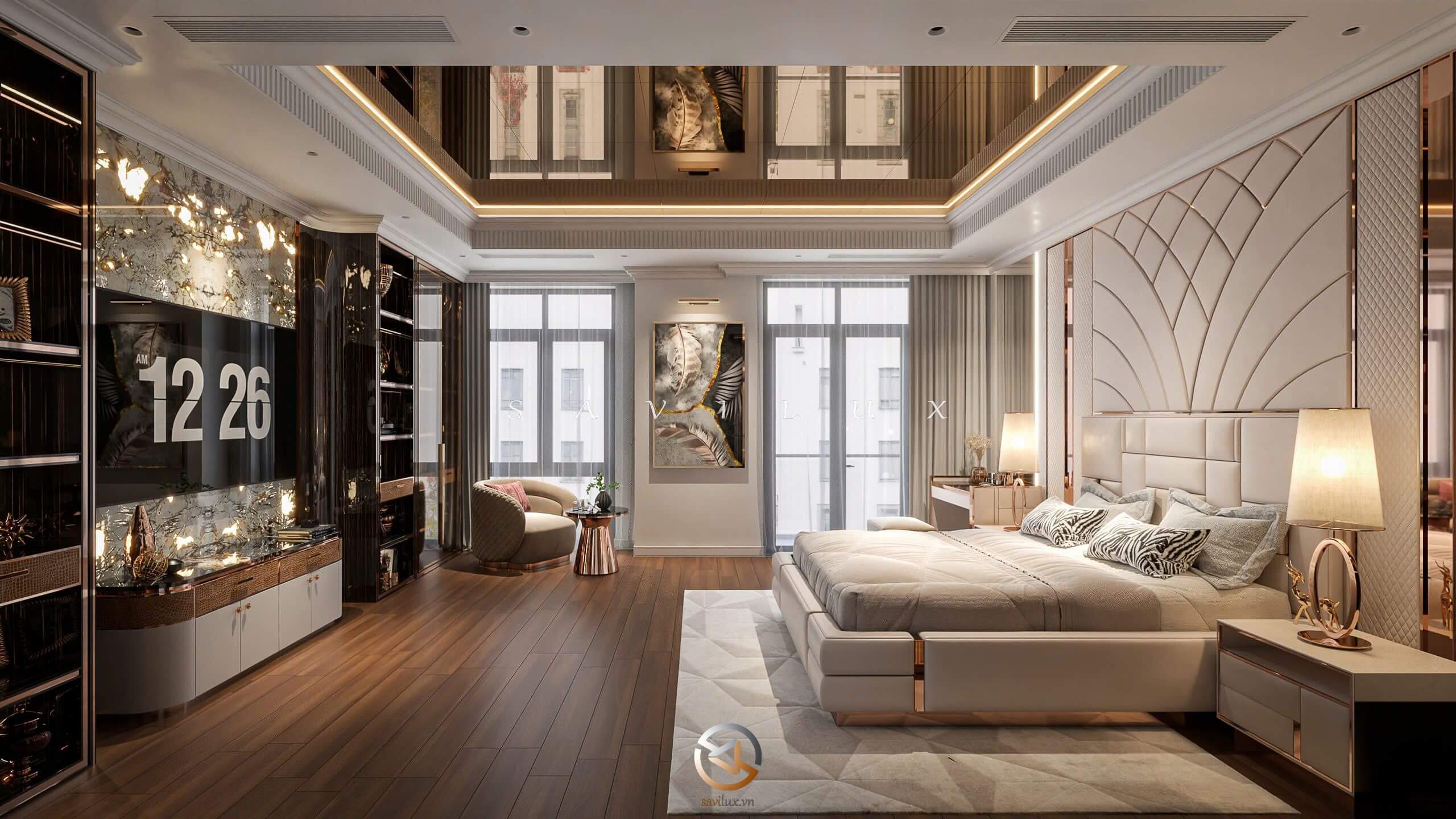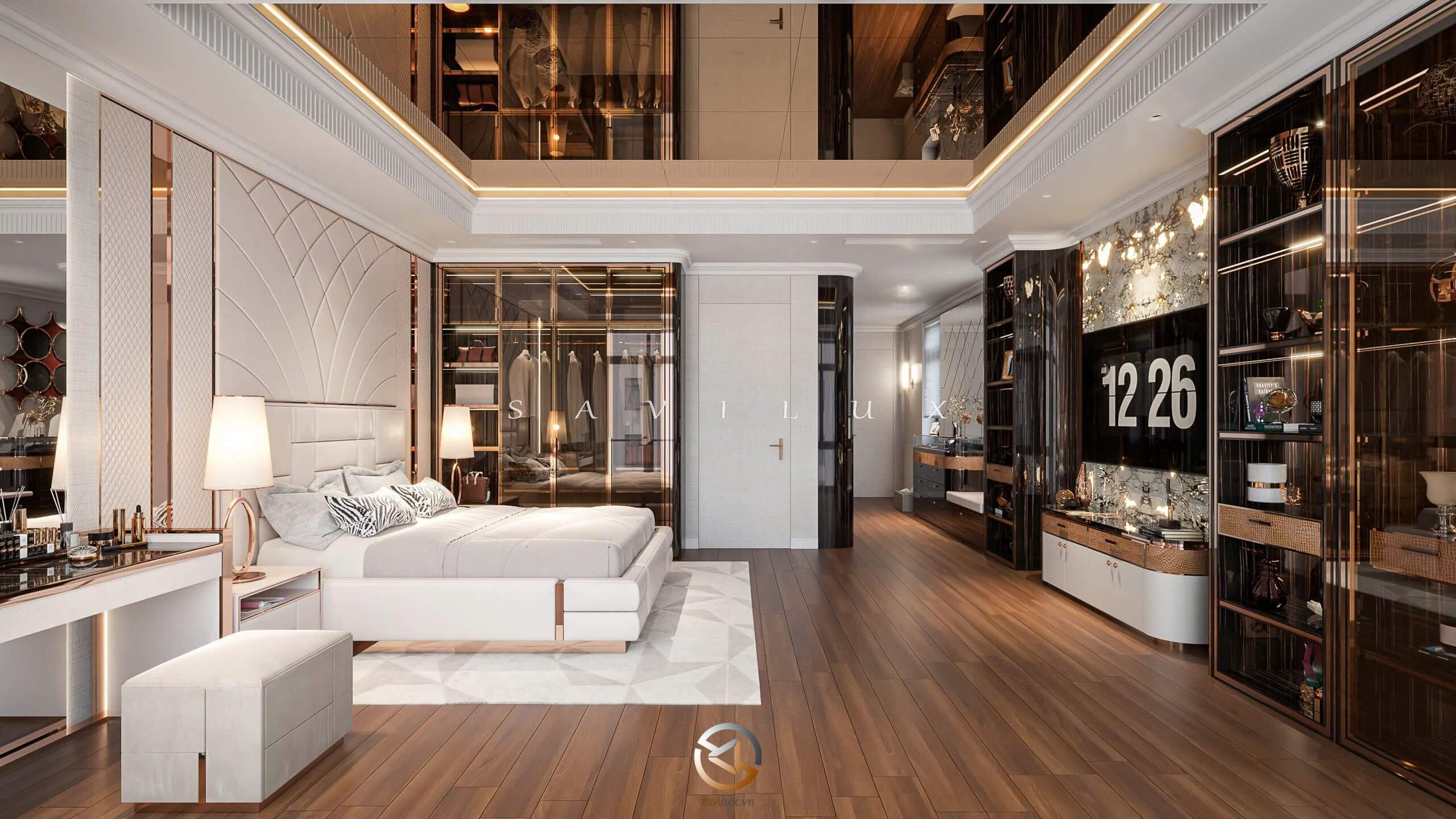 - Chân giường được ẩn tinh tế, tạo cảm giác chiếc giường như đang “trôi nổi” trên nền thảm – một hiệu ứng ánh sáng đặc trưng mà Savilux thường sử dụng trong các thiết kế cao cấp.